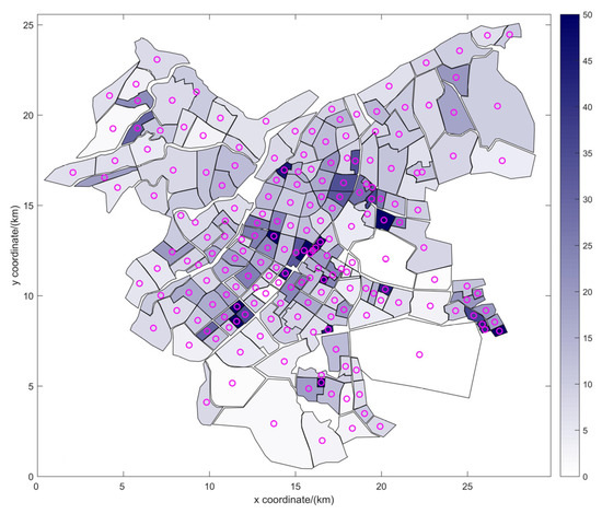 The planning scheme evaluated in this study utilized 2020 as the baseline year. Figure 3 depicts the spatial distribution of electrical loads throughout the region, along with the geographic coordinates of the power grid infrastructure. Each load zone is represented by a circle, where the pink centroid indicates the location of the equivalent load node, and the color intensity corresponds to the local load density. The power system under examination comprises 220 equivalent load nodes with an aggregate demand of 2013.74 MW as measured in the base year 2020.