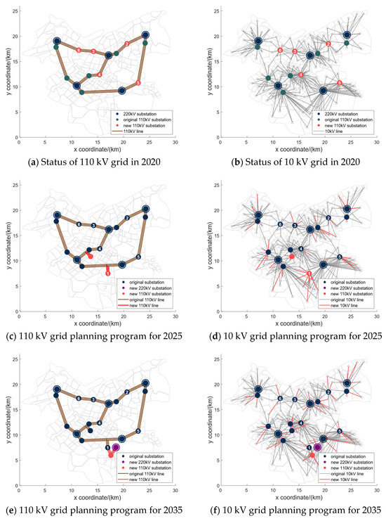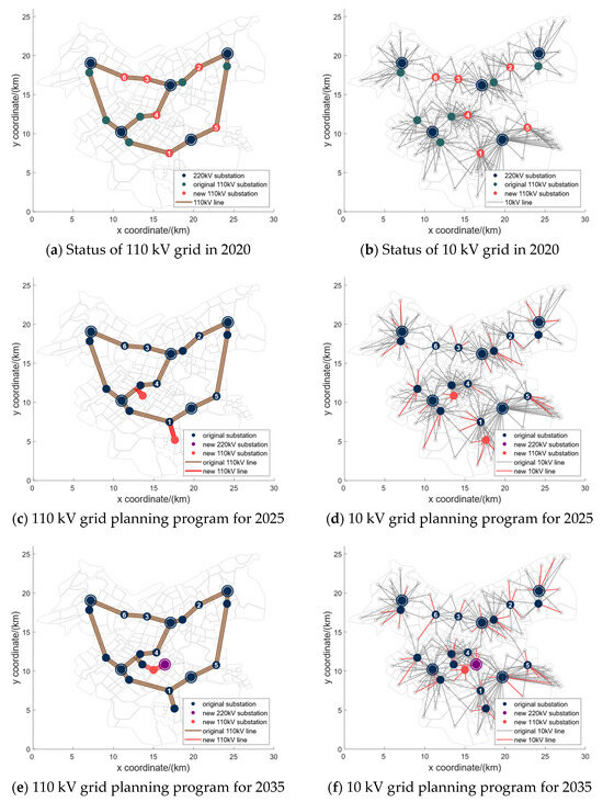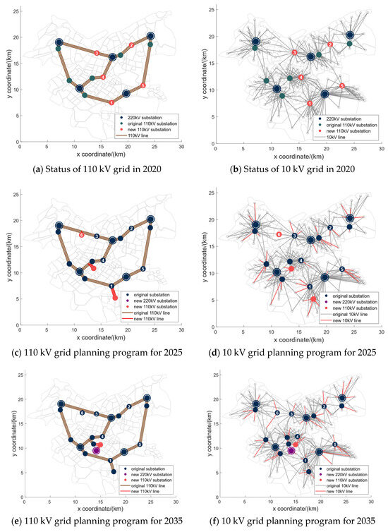 The baseline scenario assumes that all six planned substations (numbered 1–6) are commissioned on schedule prior to 2020. Based on this assumption, the evolutionary simulation algorithm generates optimal network expansion plans for 2025 and 2035 using the initial topology shown in Figure 4a,b. The resulting target network configurations for these planning horizons are illustrated in Figure 4c–f, which represent the benchmark for subsequent delay scenario comparisons.