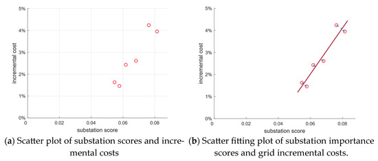 Scatter and fitting plot of substation importance scores and grid incremental costs.