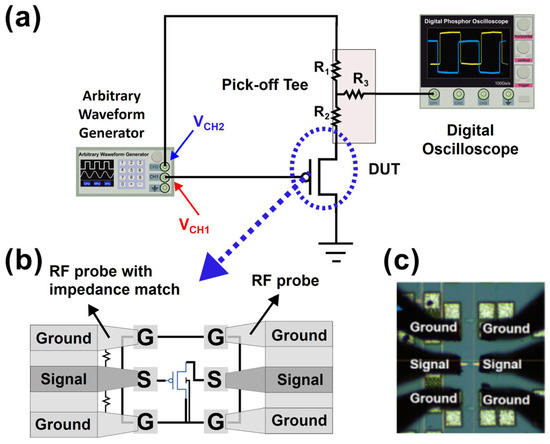 A reflection-based ultra-fast measurement methodology has been proposed for transistors’ I-V measurement on the nanosecond scale, which shows its significant potential in heat-free measurements. Note that in this study, heat-free means local self-heating has minimal impacts on the basic electric performance and reliability behavior since it takes several nanoseconds for local self-heating to increase the average channel temperature [5]. Figure 1a shows the adopted measurement setup. In order to achieve ultra-fast measurement, the generation of applied voltage pulses with a steep rise edge (small tr) and the instant capture of the corresponding output during the rise edge are essential. In this work, a small tr value of 200 ps is adopted. A high bandwidth arbitrary waveform generator (AWG) with multiple channels is used to supply voltage pulses to both gate and drain terminals through two separate channels, VCH1 and VCH2. The pick-off tee used here eliminates unnecessary reflection and acts as a power divider. A high bandwidth digital phosphor oscilloscope (DPO) is used to capture both incident and reflection signals. An RF probe with a 50 Ω impedance match is used in the gate pad, whereas a normal RF probe without an impedance match is used in the drain pad, as schematically shown in Figure 1b. To perform wafer-level RF measurements, short channel transistors used in this study are designed as a ground–signal–ground (GSG) layout, as shown in Figure 1c.