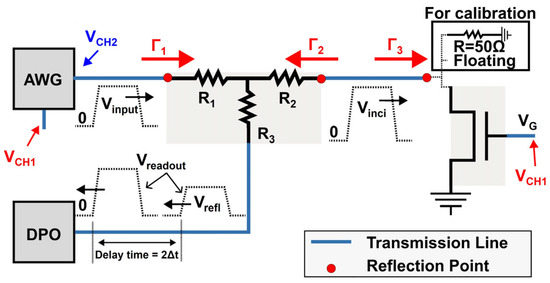 In this configuration, the signal of the gate side has no reflection from the AWG to the gate pad, ensuring its signal integrity. As for the drain side, there is a natural reflection due to the discontinuous resistance at the device drain terminal. This impedance mismatch inevitably leads to a signal reflection, which is mainly utilized to perform the measurements. All the three resistances, namely R1, R2, and R3, have a value of 16.7 Ω.