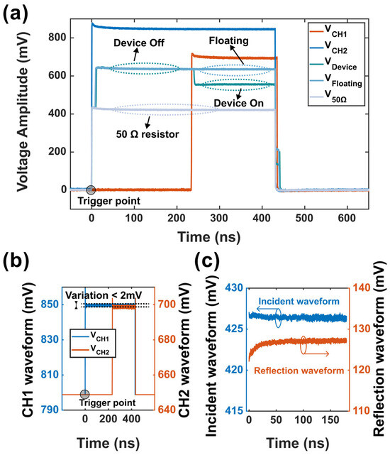 The waveforms generated by the AWG are shown in Figure 3a, labeled as VCH1 and VCH2, respectively. VCH2 is generated by the AWG CH1 channel and applied to the device gate terminal directly, whereas VCH2 is generated by the AWG CH2 channel and applied to the device drain terminal through a pick-off tee, as shown in Figure 2. Figure 3b shows the real waveform used in our test. The waveform was carefully tuned to ensure the voltage variation remained within 2 mV across a total swing of 850 mV (less than 0.24%), ensuring sufficient stability for reflection-based measurement.