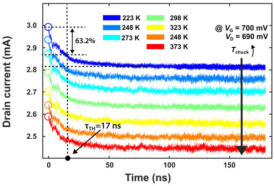 The proposed methodology is demonstrated to characterize the self-heating effect of commercial-ready scaled transistors. Figure 4 shows the drain current degradation versus the time at different chuck temperatures, ranging from 223 K to 373 K. The drain current ID decreases rapidly at the first 50 ns once the device is on, which can be mainly attributed to the local self-heating and elevated device temperature. The 63.2% current degradation is used as a criterion to extract the thermal time constant , corresponding to the classic solution of a first-order thermal RC network under a step power input, where the thermal time constant τth is defined as the time required for the temperature to rise to 63.2% of its final steady-state value. And the value of the devices in Figure 4 is about 17 ns.
