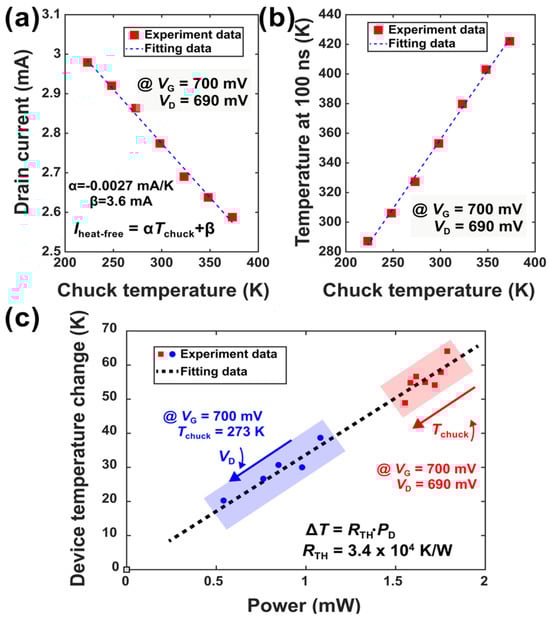 The drain current at time zero, shown as circles in Figure 4, was used as the heat-free current at different chuck temperatures. By changing the chuck temperature, a cluster of ID traces was obtained. And the heat-free current can be extracted for different chuck temperatures. Therefore, the heat-free current versus the chuck temperature can be derived, as shown in Figure 5a. This relationship can be modeled as a linear relationship of the heat-free drain current to chuck temperature as mathematically. And the real-time temperature of the device is evaluated by with the fitting parameters mA/K and mA. Specifically, and are obtained by performing linear regression between the heat-free drain current (extracted at ) and the chuck temperature, as shown in Figure 5a. The linear fitting yields mA/K and mA, with a high value indicating good agreement. These parameters are treated as constants over the tested temperature range (223 K to 373 K) due to the strong linearity observed.