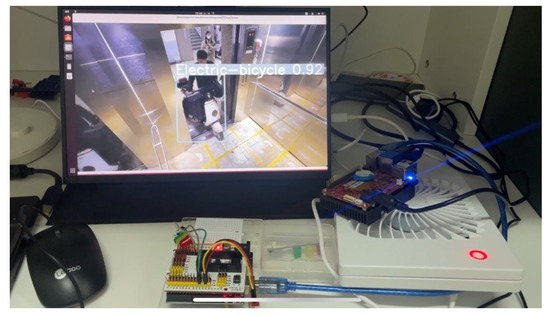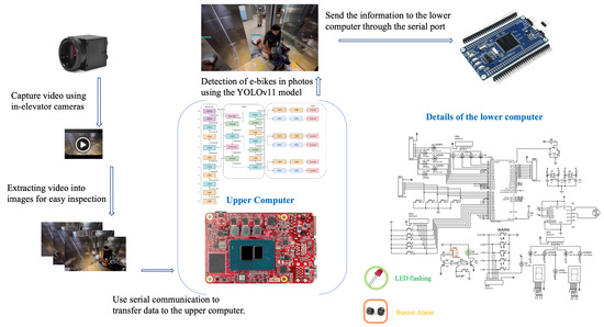 As the core hardware of the upper computer, the Nezha development board provides a reliable foundation for real-time target detection in the elevator safety monitoring system, thanks to its excellent graphic processing capabilities, extensive support for deep learning frameworks, and hardware acceleration. By deploying the YOLOv11 model on the upper computer and integrating it with the control logic of the lower computer(as shown in Figure 4), the entire system can quickly and accurately recognize electric bicycles and execute corresponding safety controls, significantly enhancing the system’s intelligence level.