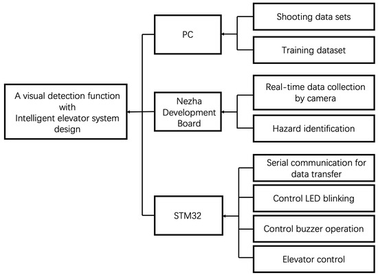 The goal of this paper is to develop an intelligent elevator safety monitoring system based on the Nezha development board and advanced deep learning algorithms to enable real-time monitoring of the elevator’s internal environment, specifically for the accurate detection and identification of potentially hazardous objects, such as electric bicycles. By integrating efficient visual detection algorithms, the system can automatically monitor the interior of the elevator, promptly issue an alarm when a dangerous object is detected, and control the elevator’s operation to prevent potential safety incidents.