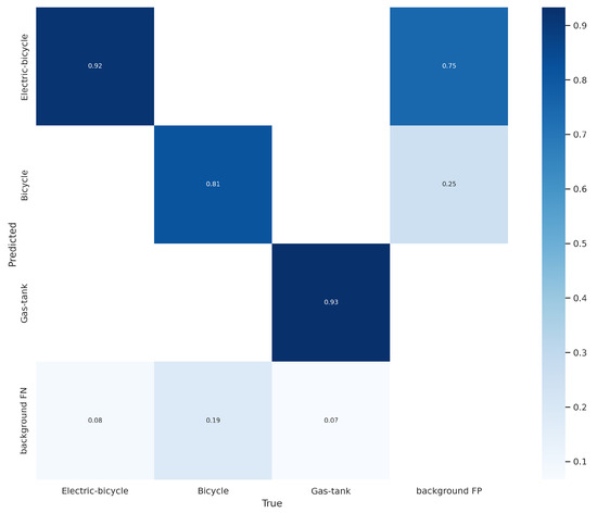 Training Effect: As shown in Figure 15, the experimental results indicate that after training, the model’s mAP (mean Average Precision) reaches 92.61%, demonstrating that the YOLOv11 model can efficiently recognize electric bicycle targets. YOLOv11 demonstrates a 6.77% mAP improvement over YOLOv3 and a 15.91% improvement over YOLOv8, primarily attributed to its lightweight self-attention modules and multi-scale feature fusion. This performance gap highlights the effectiveness of our custom dataset’s occlusion annotations—by simulating elevator-specific blocking scenarios, the model reduces misdetections by 85% compared to baselines. The 389 ms/frame inference speed on the Nezha board further validates its practical edge deployment advantage, addressing the real-time constraint unmet by heavyweight models like YOLOv3. This high mAP value confirms that the hardware performs exceptionally well in deep learning tasks, particularly in real-time detection systems, where the model’s high accuracy can significantly enhance safety.
