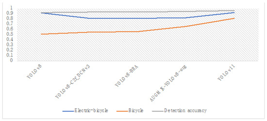 The experimental results of each model on the misjudgment of e-bikes and bicycles are shown in Figure 16, and the data in the table show that the accuracy of this system in correctly identifying bicycles is significantly higher than that of the other models, which ensures that when a bicycle is pushed into the elevator, it will not be judged as an e-bike, causing inconvenience to the users in using the elevator.