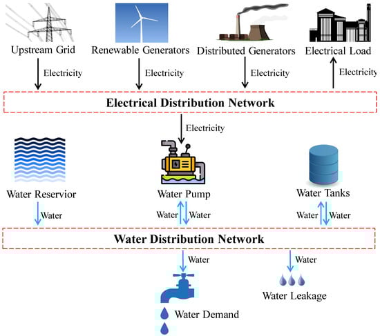 The energy sector and water systems are critical infrastructures in modern society and deeply interconnected. Energy systems are among the largest water consumers, accounting for approximately 10% of total water withdrawals globally [1]. Meanwhile, the operation of water systems highly depends on energy. For instance, water systems are responsible for about 4% of the total electricity consumption in the U.S. [2], with pumping making up the vast majority of this. Besides the direct electricity–water connection, solar power can also be used for water production and has the potential to meet water and energy demands in arid regions [3]. Further, it has also been shown in real-world practice that the impacts of contingencies and operational decisions can spread across systems [4,5]. The operation of water systems is considered a potential flexible resource to cope with the uncertainty introduced by the introduction of renewable energy sources into power systems, which is a key challenge for the future power grid. Therefore, the water–energy nexus (WEN) is emerging as one of the most important concepts for both academia and industry.