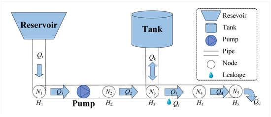 The WDN can be represented by a directed graph , as shown in Figure 2, which includes R reservoirs, P pipes, U pumps, K tanks, D water demand, and L leakage. is the set of N nodes including the set of reservoirs , tanks , and connection nodes , while is the set of E arcs (i.e., pipes) in the WDN that includes the sets of pipes without pumps and with pumps . In this paper, it is assumed that pumps are all installed in . Thus, can also represent the set of pumps in the WDN. is the set of scheduling time intervals in the proposed model.