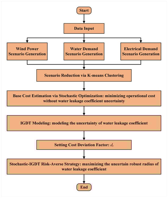 where represents the acceptable bound of the operational cost of the WEN in the risk-averse strategy, and is the robustness factor set by the WEN operator. The larger the value of the robustness factor, the less sensitive the scheme is to the fluctuation of the uncertainty quantity, the better the robustness of the model, and the stronger the risk avoidance ability of the WEN. Constraint (31) ensures that the operational cost of the WEN is bounded within the acceptable range while maximizing the tolerance of the strategy against potential water leakage conditions of the WDN. The overall procedure of the proposed hybrid stochastic–IGDT method for the risk-averse operation of WEN considering leakage is illustrated in Figure 3.