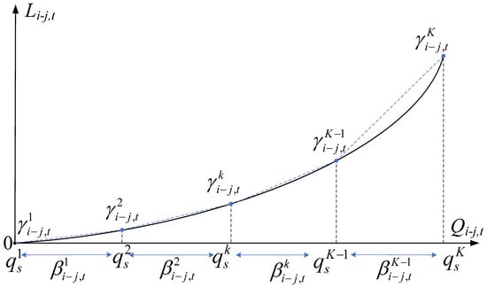 Constraint (9) illustrates the relationship between water head loss and the water flow. Figure 4 shows the hypothetical nonlinear water head loss function and the piece-wise linear approximation procedure [36]. Firstly, the axis is divided into segments evenly with K breakpoints. Each breakpoint k is associated with the sampling value of the water flow , , …, and a continuous variable . Each interval is associated with a binary variable .