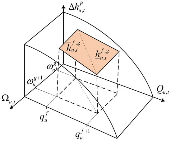 Constraints (3a) and (3b) show that the water head gain generated by pump u and the power consumed by pump u follow a nonlinear bivariate function associated with the speed of pump u and the water flow rate of pump u. As shown in Figure 5, the procedure of the linearization of Constraints (3a) and (3b) can therefore be performed using a convex combination triangulation method [36].