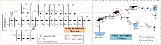 In this section, the co-optimization model for the operation of the WEN is developed and presented in detail. The WEN in the proposed model includes the electrical distribution system and the water distribution system, as shown in Figure 1. The EDN delivers electricity from the upstream power grid, renewable generation (e.g., wind turbines), and conventional distributed generators (DGs) to supply the electrical loads including the pumps in the water distribution system. Meanwhile, the water demand is supplied by the water sources (e.g., water reservoir and tanks) through the WDN while the pumps are operated to maintain proper water head and flow in the pipes. Meanwhile, the water leakage in the WDN is considered in the proposed model.