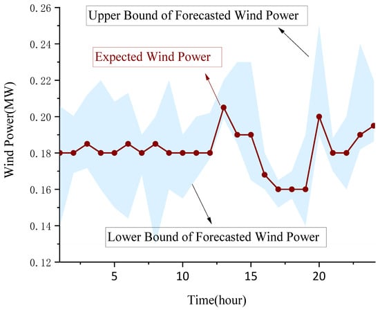 where , , and are the forecast or expected values of the output of wind turbine w, the electrical demand at node i in the EDN, and water demand at node i in the WDN, respectively; , , and are the forecast errors of the wind generation, electrical demand, and water demand, respectively. Without loss of generality, , , and are assumed to follow an independent normal distribution with a respective mean value and standard deviation [32]. For a scenario-based method, the set of uncertain scenarios can be generated through stochastic tools, e.g., Monte Carlo Simulation. In this paper, a set of uncertain scenarios is generated using Monte Carlo Simulation, and the K-mean clustering technique is applied to the scenario reduction process to obtain the typical uncertain scenario, limiting the number of scenarios for higher computational efficiency and performance while preserving the necessary elements of the original scenarios [33].