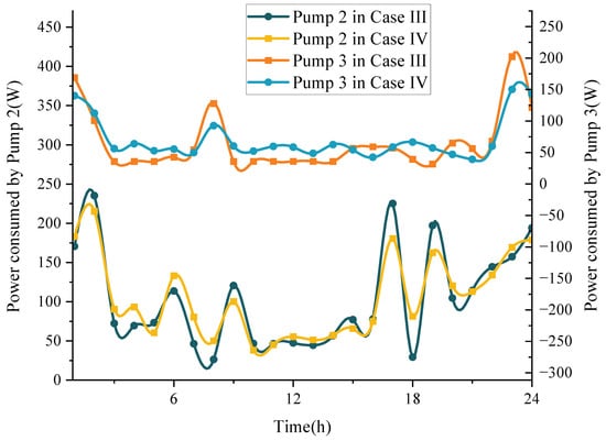 Equation (19) defines the lower and upper limits for the voltage at each bus i in the distribution network. The lower limit and the upper limit are set based on the requirements of electrical equipment connected to the buses. denotes the active power demand of pump u at time t, and and are the active and reactive power of the electrical loads other than the pumps at bus i at time t, respectively; and are the active and reactive power flows from bus i to bus j, respectively; and are the upper limits of the active and reactive power flows of the branch from bus i to bus j, respectively; and are the resistance and reactance of the branch in the EDN from bus i to bus j, respectively; is the voltage at bus i, is the rated voltage at the root bus, and and are the upper and lower voltage limits, respectively.