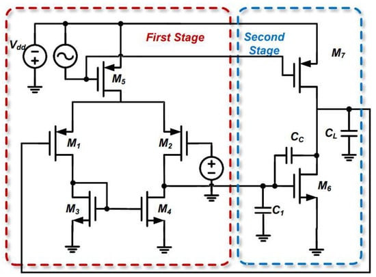 - Gray, P.R.; Hurst, P.J.; Lewis, S.H.; Meyer, R.G. Analysis and Design of Analog Integrated Circuits, 4th ed.; Higher Education Press: Beijing, China, 2005; pp. 410–415. [Google Scholar]