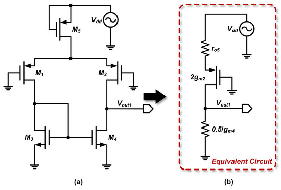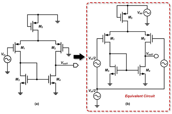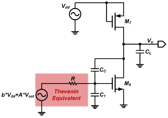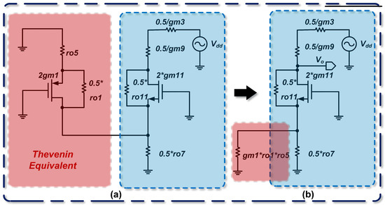 Using the Thevenin theorem, we first derive the open-circuit output voltage of the first stage. This open-circuit voltage can be computed by applying the superposition principle. The analytical approach is similar to that for the P- and N-input two-stage op-amps. First, the effect of the drain input signal from on the output is calculated. The circuit is modeled using the small-signal equivalent and further simplified via Norton’s theorem, as shown in Figure 11, yielding a Thevenin equivalent voltage of .