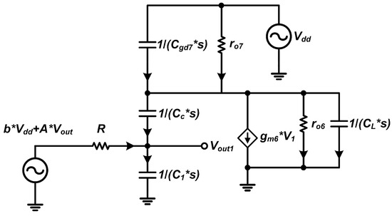 Figure 7 illustrates the equivalent circuit for the two-stage op-amp. Taking into account the gate-drain capacitance of , we employ small-signal analysis to formulate the node current equations and thereby derive the PSRR transfer function.