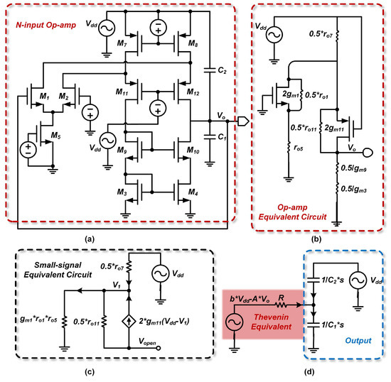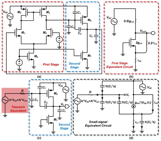 Simplified flow chart of a standard N-input two-stage op amp. (a) Full circuit of the two-stage op-amp; (b) First stage equivalent circuit; (c) Second stage with Thevenin equivalent circuit of the first stage; (d) Small-signal equivalent circuit of the second stage.