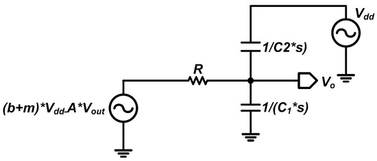 Subsequently, the effect of on the output is computed; as shown in Figure 12, the Thevenin equivalent voltage induced by is . Finally, by applying the superposition theorem, the circuit is reduced to its simplest form.