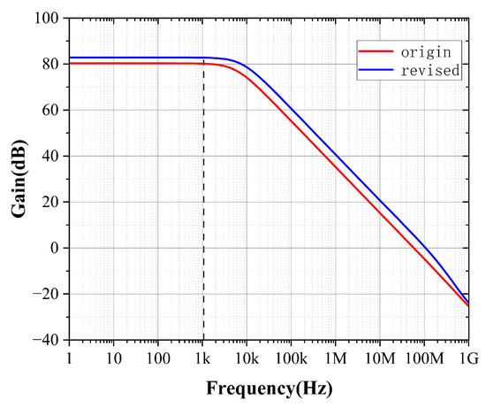 From (29), it is apparent that the PGB of the N-input is relatively smaller. It is evident that by increasing the output resistance R of the first stage and the small-signal resistance of , the DC PSRR value improves. However, the point shifts closer to the origin, thereby enhancing only the low-frequency portion of the response, while the PGB remains unchanged. Under stability constraints, reducing shifts away from the origin and improves the frequency characteristics. Comparing the PGB values for the P-input and N-input two-stage op-amps (under ideal bias conditions), the frequency response of the P-input op-amp is superior by an order of magnitude.