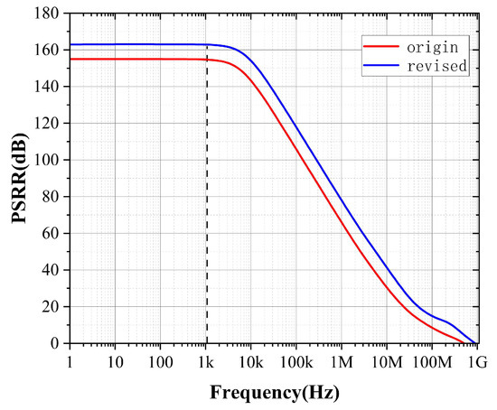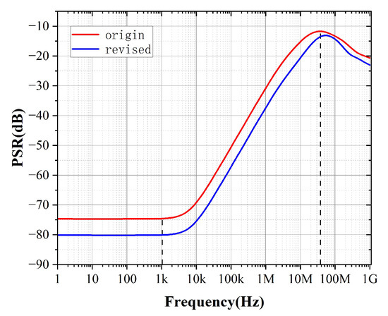 In practical industry designs, PSR is typically a direct concern because it quantifies the amount of power-supply noise propagating into the signal path. However, analyzing and optimizing PSR directly is complicated due to intricate interactions among circuit parameters and the resulting mathematical complexity. Conversely, analyzing both PSR and PSRR—especially using our proposed PGB methodology—is significantly more straightforward and intuitive. By utilizing the PGB framework, we know that we can enhance the performance of PSRR by increasing gm or reducing according to (68). The simulation results before and after the modification are shown below.
