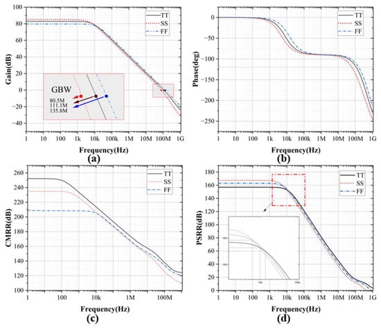 We also performed additional simulations on the circuit. Figure 21 shows the circuit’s basic indicators at different process corners, and Figure 21d shows the circuit’s PSRR at each process corner after PGB operation adjustment.