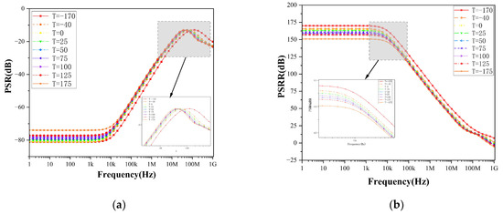 PSRR and PSR performance of the circuit under different temperature conditions. (a) PSR, (b) PSRR.