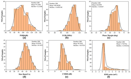 Monte Carlo simulation of (a) PSRR, (b) Unity gain bandwidth, (c) Phase margin, (d) Slew rate, (e) CMRR, (f) RMS noise.