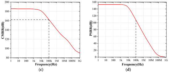 Post-layout simulation results of the proposed OTA. (a) The AC gain, (b) Phase, (c) CMRR, (d) PSRR.