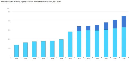 The utilization of renewable energy sources has gained remarkable prominence in the contemporary era due to the pressing concerns associated with climate change, environmental sustainability, and the finite nature of fossil fuel resources. Among the myriad sources of renewable energy, photovoltaic (PV) technology has emerged as a pivotal player in the global transition towards cleaner and more sustainable energy generation [1]. Solar PV arrays convert sunlight into electricity with a high degree of efficiency and environmental friendliness, making them an attractive choice for decentralized power generation. To harness the full potential of solar PV technology, efficient and reliable grid-connected systems are imperative [2]. Figure 1 illustrates the annual increase in renewable electricity capacity from 2014 to 2026, showing both the main case (light blue bars) and the accelerated case (dark blue portions on top of each bar) [3]. The x-axis represents the years, while the y-axis measures the additional renewable energy capacity in gigawatts (GW) per year: