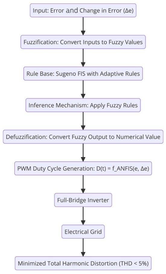 The core functionality of ANFIS lies in its adaptive capability, wherein it adjusts the parameters of the fuzzy logic membership functions using a backpropagation algorithm combined with a least squares estimation (LSE) method. This enables real-time tuning of the PWM control parameters, thereby improving the inverter’s response to dynamic grid conditions. The fuzzy inference system is structured as a Sugeno-type FIS, where each fuzzy rule is expressed in the form: : If is and is , then: