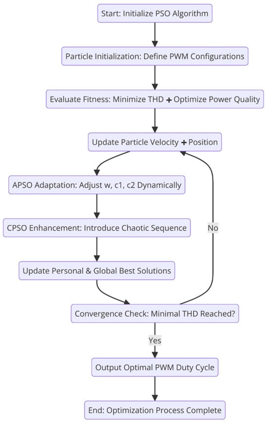 These weight values (e.g., ) were empirically selected through trial simulations to balance power quality, stability, and efficiency. Sensitivity analysis could further validate or refine these weights to adapt the fitness function for specific hardware constraints or regulatory frameworks. The proposed PSO-based PWM control algorithm works by initializing a population of particles, where each particle represents a potential set of duty cycle values for the PWM switching signals. The swarm iteratively updates its duty cycle parameters to minimize THD, ensuring a near-sinusoidal grid current.