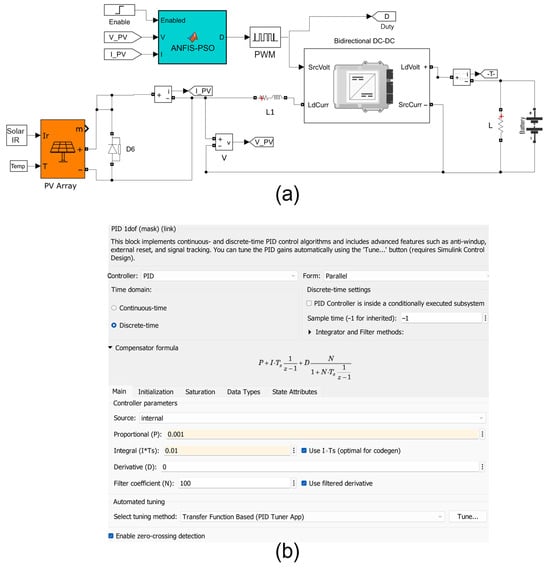 Simulink™ model of the MPPT control system and PID controller configuration window where (a) Simulink model of a PV system integrated with an ANFIS-PSO optimizer for duty cycle control of a bidirectional DC-DC converter; (b) configuration settings of the discrete-time PID controller used within the system, showing parameter values for proportional, integral, and derivative gains.