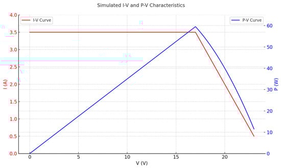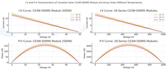 We utilized the Canadian Solar HiKu CS3W-500MS for the simulation, a 500-watt commercial-grade photovoltaic (PV) solar panel widely adopted in utility-scale, commercial, and high-efficiency residential solar installations. This module is known for its high energy yield, robust design, and reliability under varying environmental conditions. The CS3W-500MS panel uses advanced monocrystalline PERC cell technology, which enhances light capture and improves overall power conversion efficiency. The panel’s peak power output (Pmax) is 500 W, measured under Standard Test Conditions (STC): irradiance of 1000 W/m2, cell temperature of 25 °C, and air mass of 1.5 bar. The maximum power point voltage (Vmp) is approximately 41.0 V, and the maximum power point current (Imp) is about 12.2 A, making it well suited for high-capacity series–parallel configurations. These characteristics ensure efficient energy conversion, stable performance under partial shading or temperature variation, and compatibility with MPPT-based control strategies. The electrical behavior of the panel, including its I-V and P-V characteristics, is illustrated in Figure 5. The dual-axis layout illustrates the typical behavior of a photovoltaic (PV) module: current remains relatively constant up to a certain voltage, beyond which it drops sharply—resulting in the peak of the power curve. This peak represents the Maximum Power Point (MPP), a critical target for MPPT algorithms. The graph provides a visual reference for the electrical behavior of PV systems and is essential for understanding how controllers optimize performance by adjusting operating voltage.