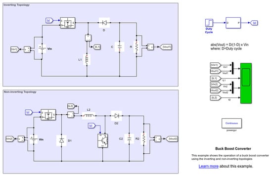Simulink™ implementation of inverting and non-inverting buck-boost converter topologies with duty cycle control.