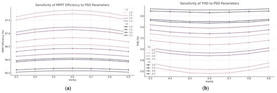 Sensitivity analysis of PSO parameters on MPPT performance, where (a) illustrates how changes in inertia weight (), cognitive coefficient , and social coefficient affect the maximum power point tracking (MPPT) efficiency. The results indicate that the combination around , and yields the highest efficiency, validating the parameter selection in the proposed method. And (b) shows the corresponding Total Harmonic Distortion (THD) behavior under different PSO parameter configurations. Lower THD values are observed in the same parameter region, emphasizing the effectiveness of these settings for both power quality and tracking performance.