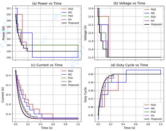 Figure 12 illustrates how five distinct MPPT algorithms (P&O [41], INC [42], PSO [43], GA [44], and the Proposed ANFIS-PSO) respond to a sudden partial-shading event on a single PV string. At time t = 0, the string’s irradiance drops so that its maximum power point (MPP) falls from the pre-shade value of approximately 150 W down to 138 W. Each subplot shows a different electrical variable (power, voltage, current, or duty cycle) as each algorithm “hunts” from the old MPP toward the new, lower 138 W MPP.