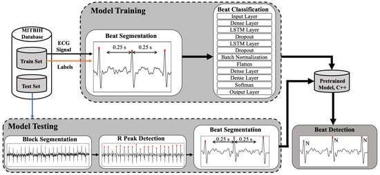 Figure 2 depicts the overall framework of the proposed classification system. The dataset was divided into 60%/20%/20% for training, validation, and test sets, respectively. The model was trained under Edge Impulse Studio®. For training, each NN frame size was set to 0.5 s of ECG data, corresponding to 180 samples for a 360 Hz sampling rate. The features were extracted for each beat and then passed into the classifier network. Three types of DNN models, ANN, CNN, and LSTM models, were tested for the proposed framework. At the end of training, the model was deployed as a C++ library. The C++ library contained all the source code and headers for the classification model. The library was integrated into the BLE chip. Each model training consisted of 50 epochs of training, along with a batch size of 32 and a learning rate of 0.005. An Adam optimizer was used with a learning rate of 0.005 and 1st- and 2nd-moment decay rate of 0.9 and 0.999, respectively. For model testing, the MIT-BIH test dataset was fed as mock data into the wearable device and tested in real time. The pretrained model was evaluated on a set of 21,892 previously unseen heartbeats. The test dataset was partitioned into arrays of 600 beats. Each of the 600 beat arrays was stored in the firmware to test the model’s performance. In total, the test dataset was segmented into 37 arrays to complete the model testing. An ECG block of 10 s was taken for the R peak detection. Upon detecting R peaks, a beat segmentation window of 0.5 s was selected for feature extraction and classification. The 0.5 s window centered on the detected R peak point and traversed 0.25 s forward and backward from the R peak.