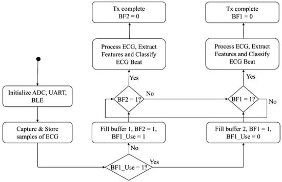 The firmware design mainly has three parts: preprocessing, feature extraction, and classification. The mutex buffer technique is implemented in the firmware to ensure continuous data storage in real time. Each buffer can hold 10 s of ECG data. Once the buffer is full, it moves forward to the data processing stages. In the meantime, the alternative buffer keeps storing the incoming data. A buffer becomes free once the corresponding BLE transmission finishes. Figure 3 provides the flowchart for the overall firmware processing.