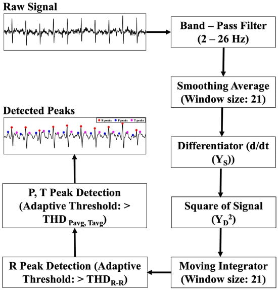 An adaptive threshold-based R-peak detection algorithm is applied to the smoothed ECG signal. The method follows the Pan–Tompkins approach. Figure 4 shows the signal processing blocks for QRS complex detection. The process involves a differentiator filter, the square of the signal, and a moving integrator. The R-peak threshold changes adaptively as shown by (1)–(3).