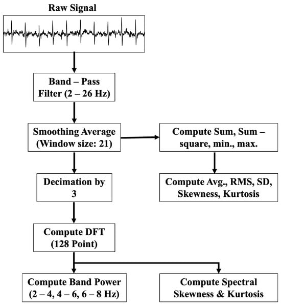 The spectral features are calculated by taking a discrete Fourier transform (DFT) on the time series data as shown in (13). The corresponding spectral power (PS) is calculated for three different frequency bands: 2–4 Hz, 4–6 Hz, and 6–8 Hz. The spectral power in each band is calculated by utilizing Equations (14) and (15). Moreover, skewness and kurtosis are calculated in the frequency domain by (18) and (19).