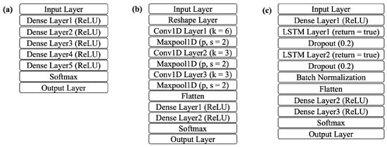 The CNN model adds three 1D convolutional layers (CL), each with a different filter size and width. The corresponding 1D maxpool layer downsamples by a factor of 2. A flatten layer follows to merge the pooled feature maps into a single vector. Two more dense layers are also added before the final classification. In the LSTM architecture, two stacked LSTM layers (LS) are employed, with dense layers placed both before and after them. LSTM layer 1 (LS1) captures forward dependencies and exposes the full sequence for the next layer. LSTM layer 2 (LS2) aggregates the sequence into a single vector. Both of the layers add a dropout layer for regularization. Table 3 presents how each model differs in layer depth and the number of units per layer. The abbreviation terms A, C, and L represent the different ANN, CNN, and LSTM model architectures, respectively.