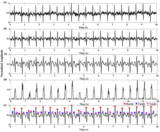ECG QRS processing: (a) raw signal, (b) band-pass-filtered signal, (c) smoothed signal, (d) moving window integration, (e) R-, P-, T-peak detection.