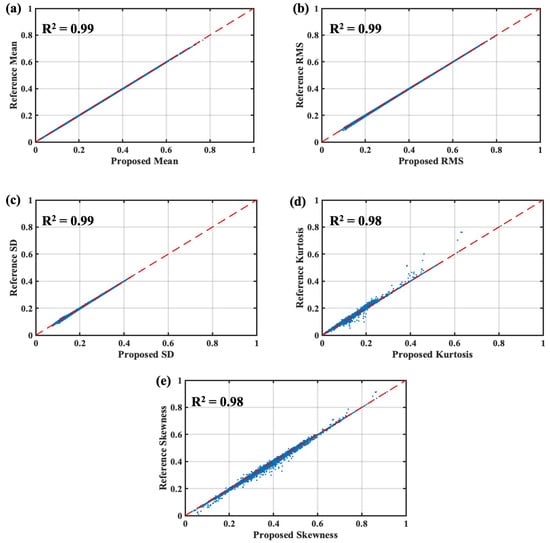 Performance of the proposed real-time time series feature extraction algorithm: (a) mean, (b) RMS, (c) SD, (d) kurtosis, (e) skewness.