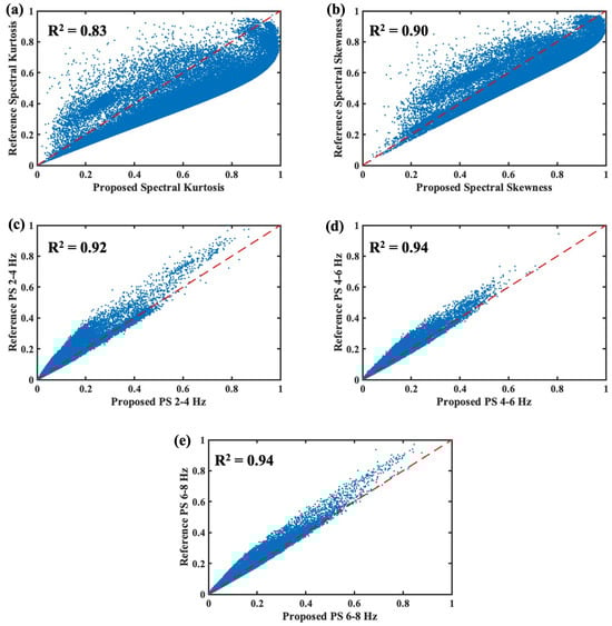 Performance of the proposed real-time spectral feature extraction algorithm: (a) spectral kurtosis, (b) spectral skewness, (c) PS 2–4 Hz, (d) PS 4–6 Hz, (e) PS 6–8 Hz.
