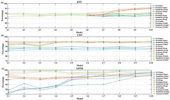 Performance of accuracy, precision, sensitivity, and F1 score for different feature sets: (a) ANN, (b) CNN, (c) LSTM.