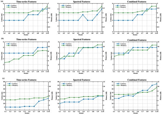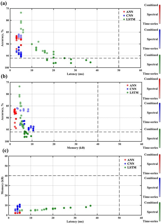 Performance of the beat classification latency and memory consumption for time series, spectral, and combined features for (a) ANN, (b) CNN, (c) LSTM.