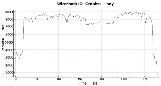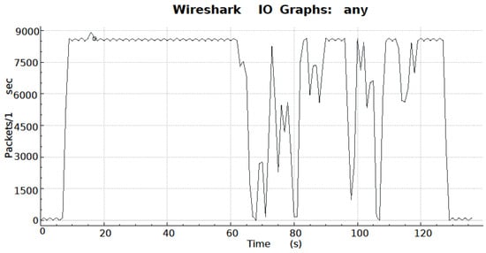 The throughput curve using the Leaf-Spine structure is shown in Figure 4. After running the scheduler using the Leaf-Spine structure, the network packet loss rate is obviously better than the Fat-Tree single channel, and the network performance tends to be stable. During the 120-s test, the network rate can be stabilized to 8 Mbps, which is basically consistent with the bandwidth set by iperf. Although the network rate fluctuated slightly at the 35th, 40th, and 63rd seconds, there was no network congestion, and the traffic was still transmitted at a higher network rate. The network rate fluctuated between 7 Mbps and 8 Mbps, which had little impact on the overall performance. In addition to throughput analysis, packet loss and jitter were measured via Wireshark logs. These showed packet drops and near-zero throughput under congestion, though detailed curves are omitted due to space constraints. Future versions of the paper will include a full set of performance indicators including packet loss rate and jitter graphs.